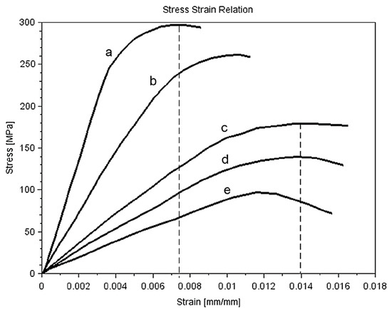 Relationship Stress-Strain for different strain ratio [26] (a) 1500 1/s, (b) 300 1/s, (c) 1 1/s, (d) 0.01 1/s, (e) 0.001 1/s.