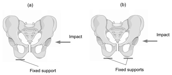 Two support configurations: (a) support on one pelvis bone on the opposite side than the impact support case I, (b) support on two pelvis bones support case II.
