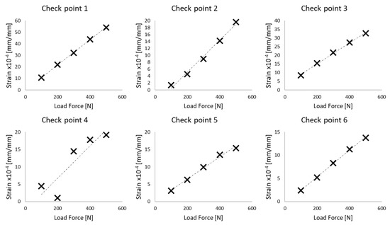 The validation process was similar to the method proposed by Hu et al. and was used successfully for a pelvic numerical model elaborated by Arkusz et al. [37]. Figure 5 shows the comparison data obtained for the presented PC model acting by the side force in the range from 100–600 N. For six different checkpoints placed on the pelvic bone, the differences between results obtained from the model and data given by Hu et al. [25] were calculated. The results are presented in Figure 5. The maximal error for the model was less than 7%. The results were similar for both analysed materials. In Figure 5, the lines represent the result for the elaborated model, and the points indicated by a cross come from the data presented by Hu et al.