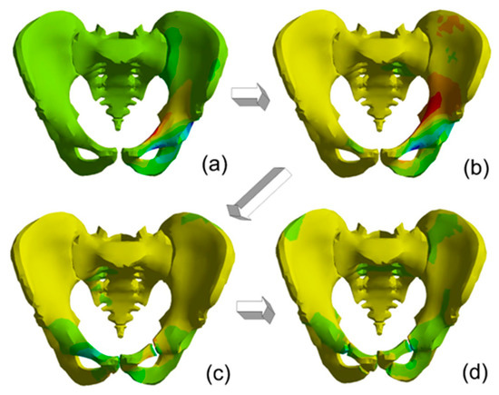 Figure 10 presents the progress in pelvic fractures under load for the II load case. The arrows show the next damage states in time.
