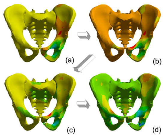 For the second support case, the maximal deformations are smaller, and the injuries created under loading are similar for different load cases. For load case III, the pelvis is not destroyed (Figure 9). The double support of pelvic bones suggested that the damages and bone depositions are smaller. The loading velocity changes the deformation map, mainly in the pelvic bones.
