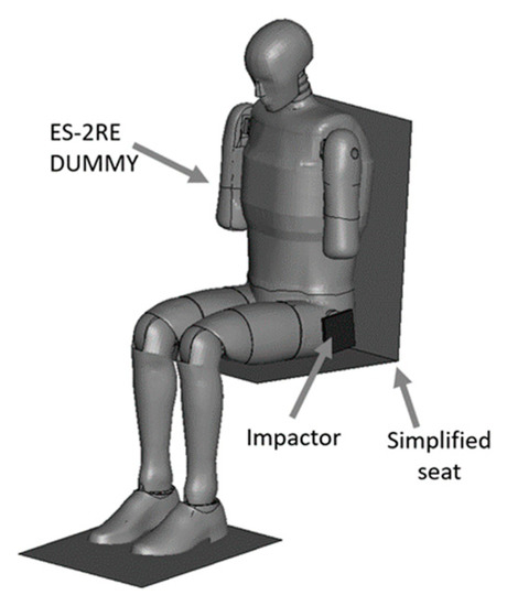 The aim of the next stage of the study was to analyse the risk of a possible pelvic injury in a soldier in a vehicle in the event of a pressure wave applied to his structure from the explosion of a charge placed next to the vehicle. For numerical analyses carried out in the LS-Dyna environment, a Hybrid ES-2RE dummy model was used, seated on a stiff chair, which was then subjected to the impact of an impactor. A view of the prepared model is shown in Figure 11.