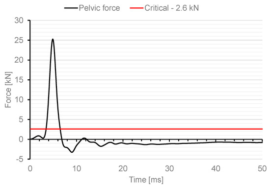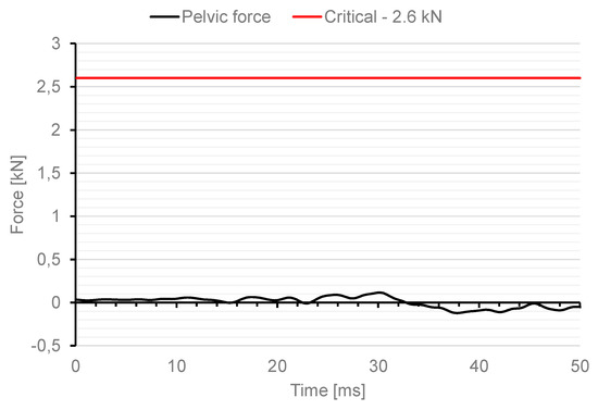 The conditions of the analysis were performed in a manner analogous to the experimental tests described in the publication [20]. For the prepared variant of loading the vehicle with the pressure wave from the explosion of a 15 kg TNT charge, the maximum value of the force in the dummy’s pelvis was 0.116 kN and the minimum was −0.123 kN. Under the given conditions of numerical analysis, there is no contact between the dummy’s pelvis and the structural elements inside the vehicle. The results obtained in Figure 14 are much below the critical value specified in AEP-55.