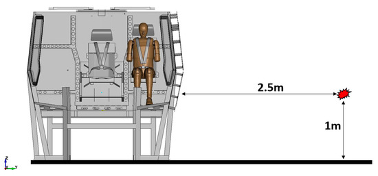 For the model of the vehicle with the dummy in the passenger seat, which was described in more detail in the publication [20], an analogous measurement of the force in the dummy’s pelvis was carried out. In this case, the vehicle was loaded with a pressure wave from an explosion of a 15 kg TNT equivalent charge, according to the diagram shown in Figure 13 below.