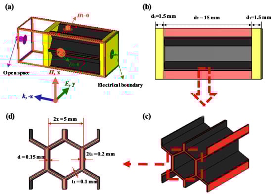 Figure 1 shows the schematic of a unit cell in the designed honeycomb sandwich structure. Firstly, the SiO2f/ER layer with a thickness d1 of 1.5 mm serving as the panel matching layer was prepared by the vacuum pressure impregnation process, in which the mass fraction of epoxy resin is 35% and the corresponding dielectric constant ε = 3.4 (1-j0.025) at 10 GHz. Secondly, the conductive coating with a thickness d of 0.15 mm was prepared using a high-speed mixer. Here, the mass fraction of conductive carbon black powders (Nanjing Xianfeng Chemical Co., Ltd., Nanjing, China) is 28% and the corresponding mass fraction of epoxy resin is 72%. Thirdly, a conductive coating was introduced into inner wall of honeycomb via the dip-coating process; here, the dipping time is 1 min, following by drying in a blast drying oven at 90 °C for 10 min. By repeating the dip-coating process on the opposite face to the previous time, the uniformity of the coating thickness along the honeycomb height direction is ensured and the coating thickness can be calculated based on the honeycomb weight gain. Fourthly, the panel and honeycomb are bonded by adhesive film, whose thickness is 0.2 mm and with the corresponding dielectric constant ε = 3.5 (1-j0.02) at 10 GHz, which can be studied together with the panel.