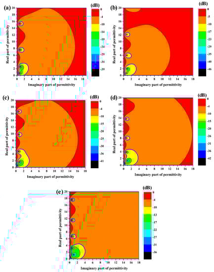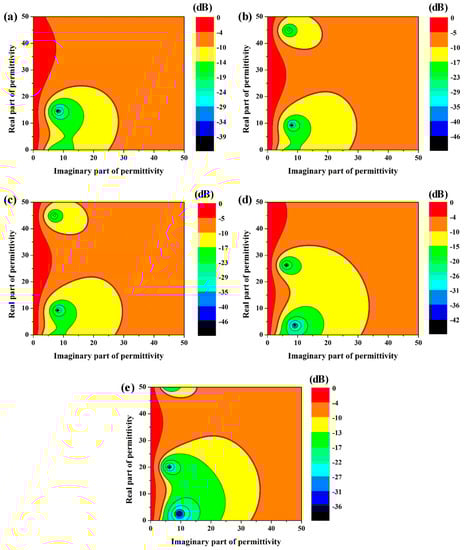 Reflection loss spectrums of the coated lossy material with different dielectric properties: (a) 8.2 GHz, (b) 9.2 GHz, (c) 10.2 GHz, (d) 11.2 GHz, and (e) 12.2 GHz.