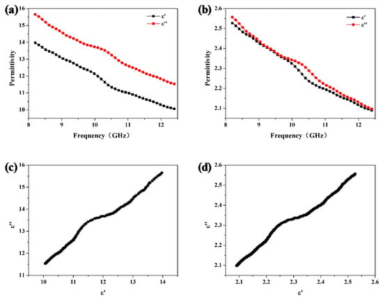 In order to improve microwave absorption property of the honeycomb sandwich structure, a carbon black/ER composite with dielectric properties in the target range of coated lossy material obtained from Section 3.1 is introduced into the honeycomb inner wall with a coating thickness of 0.15 mm. The respective dielectric properties of the coated lossy material and corresponding honeycomb are shown in Figure 4a,b. It is obvious that the coated lossy material and corresponding honeycomb have a significant frequency dispersion effect, thus exhibiting a greater hysteresis effect of polarized charges and enhancing the loss of microwave energy. For dielectric lossy material in this work, the cole–cole diagram reflects its microwave loss mechanism. Specifically, one semicircle indicates one Debye polarization and relaxation process and one straight line indicates a conductive loss dominated loss mechanism. Figure 4c,d exhibits the respective cole–cole diagrams of the coated lossy material and corresponding honeycomb, which indicate a loss mechanism dominated by conductive loss.