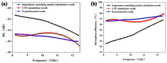 Reflection loss (a) and corresponding microwave absorption efficiency (b) of the impedance matching model calculation result, CST simulation result, and experiment result.