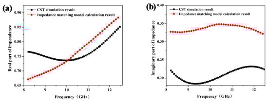 Real (a) and imaginary (b) part of impedance obtained from the CST simulation result and impedance matching model result.