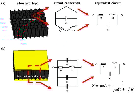 According to the structural characteristics of the honeycomb core and honeycomb sandwich structure, the respective equivalent circuit models are shown in Figure 7. Here, C1 represents the capacitance between opposing honeycomb walls; R1 and L1 represent the resistance and inductance, respectively; and C2 and C3 represent the capacitance of the upper and lower panel, respectively. According to the equivalent circuit, the impedance of the honeycomb sandwich structure can be expressed as follows: