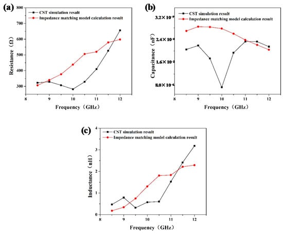 Resistance (a), capacitance (b), and inductance (c) obtained from the CST simulation and impedance matching model.