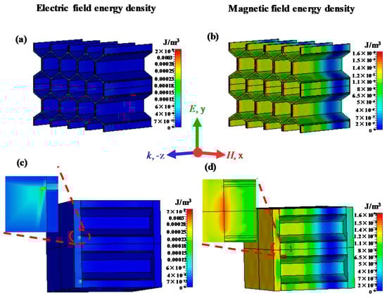 Simulated distributions of electric field energy density (left) and magnetic field energy density (right) of microwave-absorbing structures: (a,b) honeycomb core; (c,d) honeycomb sandwich structure.