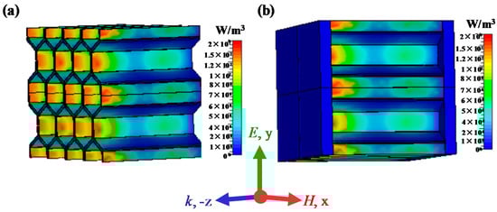 Simulated distributions of the power loss density of the (a) honeycomb core and (b) honeycomb sandwich structure.