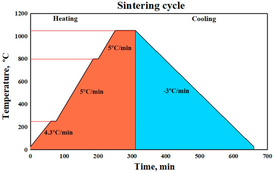 Green samples were prepared by cold pressing in a cylindrical hardened steel die (Ø 10 mm × 4 mm length) under various values of pressure (50 MPa, 200 MPa, 350 MPa). The samples were kept at the highest pressure for one min at room temperature. The green compacts were then sintered at 1050 °C for one hour in a vacuum atmosphere. Sintering was carried out under a continuous primary vacuum atmosphere in a vacuum sintering furnace that located in Central Metallurgical Research and Development Institute in Egypt (model furnace of 121212-50, GEA/Vacuum Industry, USA). The sintering cycle applied for all experiments is shown in Figure 1, where it includes the following steps: