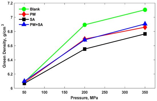 The green density of Cu–15Fe samples under different lubricants along with the different pressure levels used are shown in Figure 2. It can be seen that the green density of the compacted samples increases with increasing the compaction pressure for all samples. With an increase in pressure from 50 MPa to 200 MPa, the green density of blank samples improved by 13.2%, but this rate dropped to 3% with an increase in pressure to 350 MPa. Additionally, the green density of PW samples rose with increasing the pressure from 50 MPa to 200 MPa by 10%, and by 2.5% from 200 MPa to 350 MPa. Furthermore, the increase in green density for SA samples was 8% higher when the pressure increased from 50 MPa to 200 MPa, and it was 3.2% higher when the pressure increased to 350 MPa. Similarly, with a rise in the pressure from 50 MPa to 200 MPa, green density in PW+SA samples increased by 9.5%; at 350 MPa, it rose by 3.4%. It is evident that the rate of increasing the green density from 50 MPa to 200 MPa is greater than the rate of increasing the green density from 200 MPa to 350 MPa.