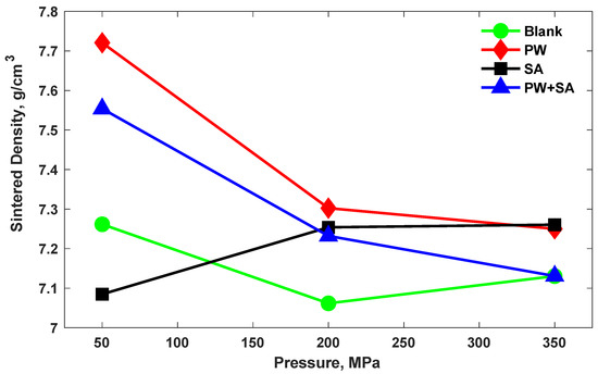 On the other hand, the density of Cu–15Fe sintered samples under several pressure values is presented in Figure 3. It can be seen that the densification of both the PW samples and PW+SA samples significantly decreased with increasing compaction pressure. The sintered density of PW samples decreased by 5% when the pressure was raised from 50 MPa to 200 MPa, and by 0.7% with increasing pressure from 200 MPa to 350 MPa. Likewise, the sintered density decreased by 4% and 1.4% in PW+SA samples with increasing pressure. The reason for this is because the lubricant does not easily exit out of the material during sintering when the pressure is high, since the pores are not interconnected. On the contrary, the sintered density of the SA sample improves by 2.4% and 0.1% as the compaction pressure is increased, which is caused by the lower melting point of SA compared with that of PW; this increases its ability to escape from narrower pores. It also appears that the PW sample has the highest sintered density at a pressure of 50 MPa (the lowest pressure) by 5.7% in comparison with the blank sample. Moreover, the SA sample has the largest sintered density under a pressure of 350 MPa (the highest pressure) by 2% in comparison with the blank sample. At a pressure of 50 MPa, the sintered density of the PW+SA sample is higher than that of the SA sample and lower than that of the PW sample. On the other hand, the sintered density of the PW+SA sample when subjected to a pressure of 350 MPa is the lowest of all the samples tested, and it is the same as the sintered density of the blank sample.