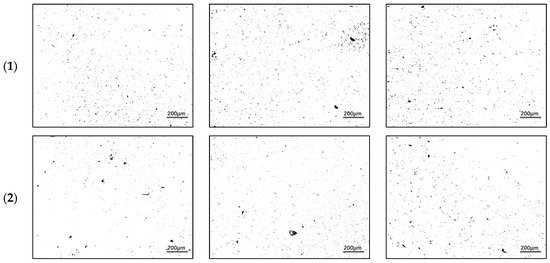 ImageJ software was used to conduct an investigation of how the area porosity changes and the distribution of pores varies in the sintered Cu–15Fe powder compacts subjected to a variety of lubricant types while under various compaction pressures. Figure 4 depicts the sintered samples’ pore structure and distribution, while Table 2 lists the changes in the area porosity that may be detected as a result of the sintering process. When examining the blank sample, it is possible to observe that the average size of pores (from Figure 4(a1–c1)) as well as the percentage of area pores (from Table 2) became large as the pressure rose from 50 MPa to 200 MPa; however, when increasing the pressure to 350 MPa, the rate of percentage of area pores became slightly lower than it had been at a pressure of 200 MPa (from 1.24% to 1.1%). In addition, the percentage of area pores at 50 MPa is the lowest in the PW sample (0.5%), but the average size of pores in this sample at 50 MPa is greater than that in the blank sample, as shown in Figure 4(a2–c2). As the pressure is increased (in 200 MPa and 350 MPa), it is possible to observe an increase in the percentage of area pores (0.77% and 0.85% respectively) while simultaneously observing a drop in the average size of pores.