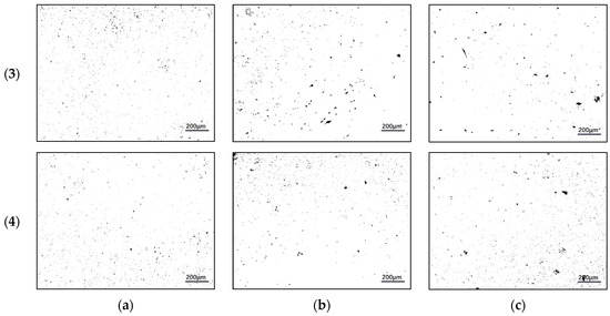 Optical micrographs of sintered Cu–15Fe powder compacts: (1) blank sample, (2) PW sample, (3) SA sample, and (4) PW+SA sample under different pressures: (a) 50 MPa, (b) 200 MPa, and (c) 350 MPa.