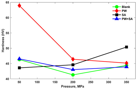 Vickers hardness tests are employed to determine the bulk hardness of sintered samples. Figure 5 shows the variation of hardness for all the sintered samples at the various compaction pressure levels. The plot of PW samples shows that with raising of the compaction pressure, the measured hardness decreases by 27.4% and 2.7%, from 50 MPa to 200 MPa and 200 MPa to 350 MPa, respectively. Additionally, according to a plot of PW samples, the measured hardness reduces by 7.6% as the pressure increases from 50 MPa to 200 MPa and rises slightly by 2% as the pressure is further increased to 350 MPa. Moreover, for the blank samples, with increasing pressure from 50 MPa to 200 MPa, the measured hardness decreases by 10.8%, and with increasing pressure from 200 MPa to 350 MPa, the hardness increased by 7.5%. Additionally, the hardness values of the SA sample increase as the compaction pressure increases by 2.3% and 13% from 50 MPa to 200 MPa and 200 MPa to 350 MPa, respectively, which agrees well with the findings for density versus compaction pressure of SA lubricant.