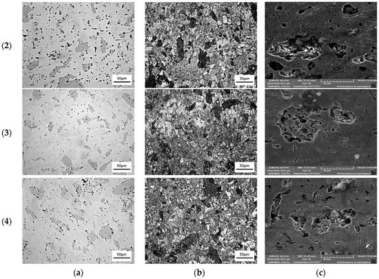 A standard metallography procedure was used to prepare the surfaces of the sintered samples. The specimens were coarsely polished with abrasive papers of 600, 800, 1000, 1200, 1500, and 2000 grit. Fine polishing was carried out using a 0.3-micrometer alumina paste. After polishing, the samples were etched in an aqueous solution containing 25 g of ferric chloride (), 10 mL of hydrochloric acid (HCl), 100 mL of ethyl alcohol (), and 100 mL of . The etching was performed for 30 s, and afterwards the samples were rinsed in water and blow-dried. The samples’ metallography before and after etching were performed using an optical microscope (Nikon, Tokyo, Japan).
