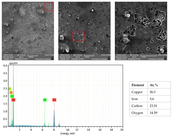 The SEM micrographs and corresponding EDS analysis of the PW+SA sample at a pressure of 200 MPa are shown in Figure 7. The results of the EDS analysis show that the dark grey areas represent the iron-rich phase that is distributed throughout the Cu-rich matrix. During the sintering process, the paraffin wax evaporates, which results in the diffusion of carbon onto the surface. Additionally, the chemical solution etching process results in the diffusion of oxygen onto the surface. It is important to note that the carbon percentage in the EDS analysis indicates that the lubricant (both PW and SA) is distributed evenly throughout the Cu–15Fe matrix.