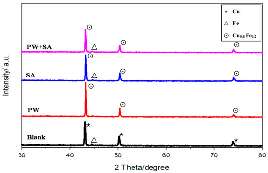 XRD analysis results of the Cu–15Fe sintered samples with different amounts of composite lubricant at a compaction pressure of 200 MPa are shown in Figure 9. The most noticeable pattern is that the recorded peaks correspond to the free FCC copper and BCC iron in the blank sample, while the recorded peaks in the PW, SA, and composite lubricant samples were Cu0.8Fe0.2 and BCC iron. The new phase of Cu0.8Fe0.2 demonstrates that iron gradually reacted with copper to form a supersaturated solid solution with the help of the lubricant. The peaks that are specific to the BCC iron phase are less intense, and the Cu and Cu0.8Fe0.2 diffraction peaks are asymmetric. The peaks that are specific to the BCC iron phase are not found in the PW sample, demonstrating that the paraffin wax lubricant has a good reaction with the Cu–15Fe composite powder.