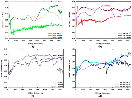 The coefficients of friction data for blank samples under three pressures (50–200–350 MPa) are presented in Figure 10a. When the blank sample reached steady-state, the µ was extremely low, with a range of between 0.13 and 0.23 under 50 MPa of pressure. However, when the pressure was increased to 200 MPa, the µ rose significantly and varied from 0.22 to 0.37. For the blank sample at a pressure of 350 MPa, the µ ranged from 0.22 to 0.32, which was lower than that at 200 MPa pressure. As seen in Figure 10b, µ data of PW samples are displayed at three pressure levels (50–200–350 MPa). It is apparent that once the steady-state condition had been reached, the µ data of the PW samples under different pressure levels increased with increasing pressure. According to the PW sample, µ values ranged from 0.16 to 0.24 under a pressure of 50 MPa. When the pressure was increased to 200 MPa, the µ values rose from 0.23 to 0.31. At 350 MPa of pressure, µ again jumped to 0.22–0.32. As can be seen from these results, the µ values of PW samples were greatly affected by the application of high pressure because of the formation of a layer of carbon on their surfaces.