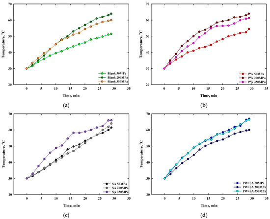 A comparison of friction temperature gains for sintered Cu–15Fe composite samples with a given sliding distance, under different lubricants, is illustrated in Figure 12. The friction temperature gain that was measured for the blank sample is displayed in Figure 12a. The friction temperature gain of blank samples increases with progressively increasing pressure from 50 to 200 MPa, then barely begins to dip at a pressure of 350 MPa. According to the analysis of the previous results, the variance of the friction temperature gain curves is entirely contradictory with the specific wear rate curves of blank samples at the same pressures. Specifically, this is due to the high level of heat generated during the process of plastic deformation. Moreover, oxidation created a solid oxide friction film that reduced the wear rate at high friction temperature gain, and vice versa. The recorded friction temperature gains of PW samples are plotted in Figure 12b. As it can be seen from the graph below, the friction temperature gains of PW samples rise as the pressure increases from 50 to 200 MPa, and slightly declines at a pressure 350 MPa. The friction temperature gains that were recorded by the SA and the PW+SA samples, respectively, can be seen in Figure 12c,d. As pressure rises from 50 to 350 MPa, the friction temperature increases, as shown in Figure 12c. There is also a converging pattern to the changes in friction temperature gains between SA samples at different pressures. According to Figure 12d, the friction temperature gains of PW+SA samples decrease with increasing pressure from 50 to 200 MPa, and increase at a pressure 350 MPa until it reaches the same gain at 50 MPa (i.e., the slope of the friction temperature gain curves of PW+SA samples at pressure 50 MPa are more identical that ones at pressure of 350 MPa). A review of the previous data suggests that the variance in the friction temperature gain curves is more consistent with the specific wear rate curves of the PW, SA, and PW+SA samples at the same pressures.