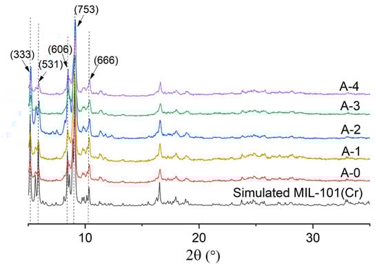 The nitrogen adsorption–desorption curves of the samples are shown in Figure 2, and the adsorption and desorption curves of the samples did not completely overlap. The hysteresis loops indicated that the pore structures of the samples were irregular and contained two or more types of pore structures []. The pore structure information of each sample is shown in Table 1. The specific surface area of the MIL-101(Cr), synthesized using only acetic acid as the modulating agent, was 3006 m2 g−1. However, the addition of SiO2 decreased the specific surface area of MIL-101(Cr). In particular, when the addition amount of SiO2 was 200 mg, the BET-specific surface area of A-4 was 2693 m2 g−1. Interestingly, adjusting the amount of SiO2 increased the ratio of macro-mesopores to micropores (Smacro-meso/Smicro). The Smacro-meso/Smicro ratio increased from 4.62:1 to 12.8:1 when the addition amount of SiO2 was raised from 50 mg to 200 mg (see Table 1). Combined with the Barret–Joyner–Halenda (BJH) pore size distribution curves of the samples (Figure 2b), we found that involving the addition of SiO2 as a template created more macro-/mesopores. Thus, A-4 had the highest Smacro-meso/Smicro ratio among all samples. The specific surface area was influenced by many factors, such as particle size and pore structure. In general, the smaller the particle size was and the simpler the pore structure of MIL-101(Cr) was, the higher its specific surface area was. In our study, A-4 contained the most abundant macro-/mesoporous structure and the most relatively large particle size; thus, it possessed relatively low specific surface area.