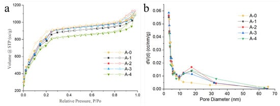 The adsorption properties of A-0, A-2, and A-4 were tested using aqueous solutions of methylene blue (7.9 Å × 16.3 Å, Figure S2a) and Coomassie Brilliant Blue (15.1 Å × 24.1 Å, Figure S2b in the Supplementary Section). A-4 showed the best adsorption capability toward CBB and MB among all of the samples, with the adsorption amounts of 82.1 mg g−1 and 34.3 mg g−1 (Figure 4), respectively, attributable to its high Smacro-meso/Smicro ratio structure. The more mesopores that a sample had, the better that the large molecular dyes were adsorbed. Hence, we were not surprised that A-4, which possessed the highest Smacro-meso/Smicro ratio, exhibited the best adsorption capacity for the large molecular dyes in CBB and MB.