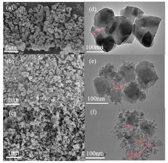 Scanning electron microscope (SEM) and transmission electron microscope (TEM) images of the samples showed that the SiO2-free sample A-0 presented a uniform particle size of ~138 nm with a relatively regular morphology (Figure 3a,d and Figure S1a in the Supplementary Section). There was a weak nanofusion phenomenon at the boundary of the crystals and a trace of mesoporous structure (red dashed area). Samples A-2 and A-4 showed irregular polyhedral morphology, with the adjacent crystals showing nanofusion and forming mesoporous structures (Figure 3b,c,e,f). The difference was that A-4 had a higher degree of nanofusion and formed more abundant mesoporous structures (red dashed area).