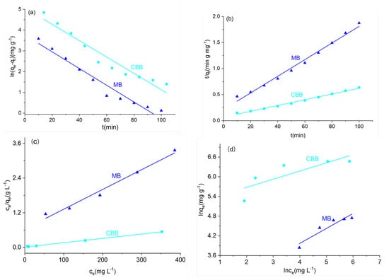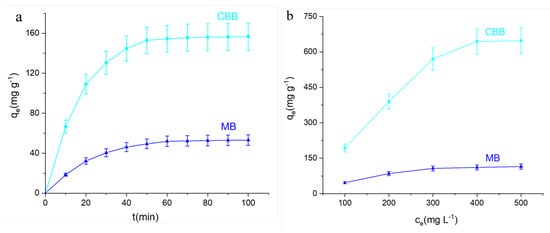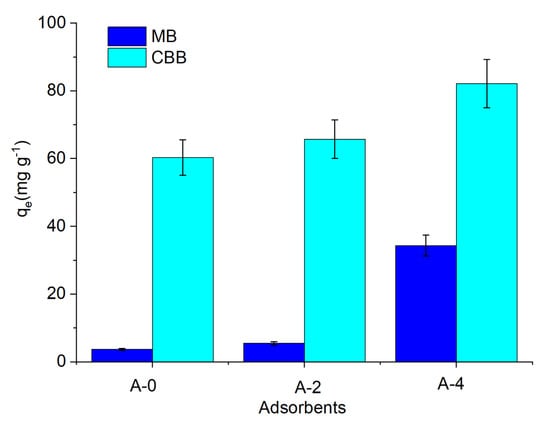 The adsorption capacity qe (mg g−1) of the adsorbent for the dyes was calculated using the formula shown in Equation (1) [].