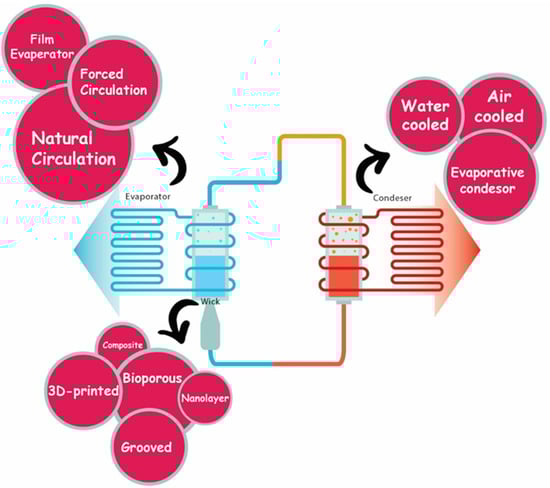 - Vinod, R.; Basavarajappa, Y. Recent advances in loop heat pipe. Mater. Today Proc. 2021, 45, 389–391. [Google Scholar] [CrossRef]