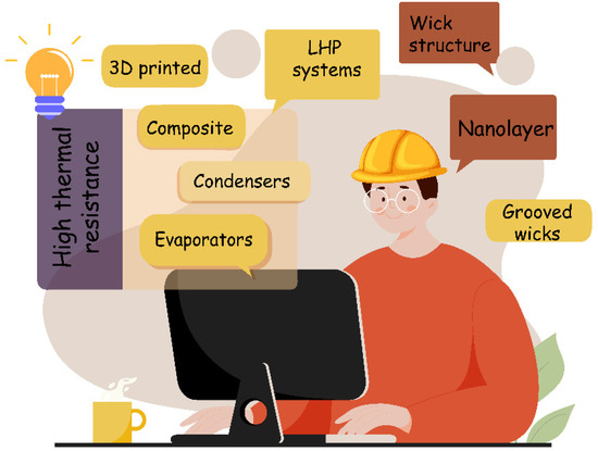 Although the importance of LHPs in a wide range of applications has been recognized, work on the wick structures as an important part of LHPs is still in the early stages of its development. In this review, a particular emphasis has been dedicated to providing a broad overview of the topic of LHPs using wick structures based on very recently released publications. In the first section, we briefly introduce some vocational challenges and difficulties that exist in the development of LHPs. Then, we explain the latest wick families studies that play an effective role in the LHP systems. The heat transfer, permeability, thermal resistance, and heat transfer capacity of LHPs have been discussed by considering the performance of wick structures. Herein, the literature are categorized and fully discussed based on the most current wick structures that have been used for the enhancement of LHP performance, which include bi-porous, grooved, nano-layers, composite, and additively manufactured structures. To delve into deeper layers of the trend of important parameter changes such as heat transfer capability and thermal resistance, the most probable wick structure to show a higher heat transfer coefficient is highlighted. It should be noticed that composite wicks, including composite screens and screen-covered grooves, provide high-capillary pressure and high permeability, but this structure requires complex manufacturing steps [27,28,29]. On the other hand, additive manufactured structures, as an alternative to previous structures, allow much greater freedom in defining the wick geometry and properties [30,31]. Since the most important goal in the performance of LHPs is to achieve higher heat transfer, future research can focus on designing and engineering new wick structures.