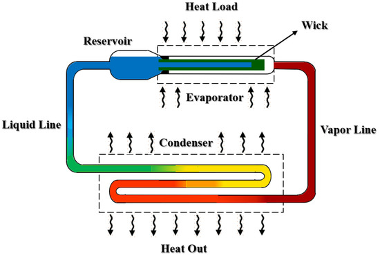 In recent decades, passive two-phase devices have been developed to solve the thermal control of compact devices with high heat flux and limited space. As highly efficient heat transfer devices, loop heat pipes (LHPs) are highly promising thermal management devices which utilize the phase changing of working fluid to transfer heat and capillary force to drive the fluid cycle [1,2,3]. The history of LHPs originates from 1972, when they were first invented in the former Soviet Union [4]. In comparison with similar two-phase devices such as capillary pumped loops (CPLs) and heat pipes, LHPs have superior heat transfer capabilities, much higher capacity at comparable dimensions, reliable operation in a gravitational field, compact and efficient design, lower thermal resistance, flexible transport lines, minor dependence on the orientation in the gravity field, and considerably higher heat transport capacity for much longer distance [5,6,7,8]. The LHP system consists of different components: an evaporator filled with a fine porous structure (wick), condenser, vapor line, liquid line, and compensation chamber. The components of an LHP are shown in Figure 1, which consists of the main parts and some detailed components.