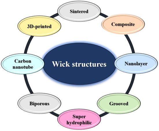 The most common wick types are sintered powder, metal meshes, composite wicks, sintered metal fibers, grooved wicks, additively manufactured wicks, mesh-groove wicks, and bi-porous wicks.