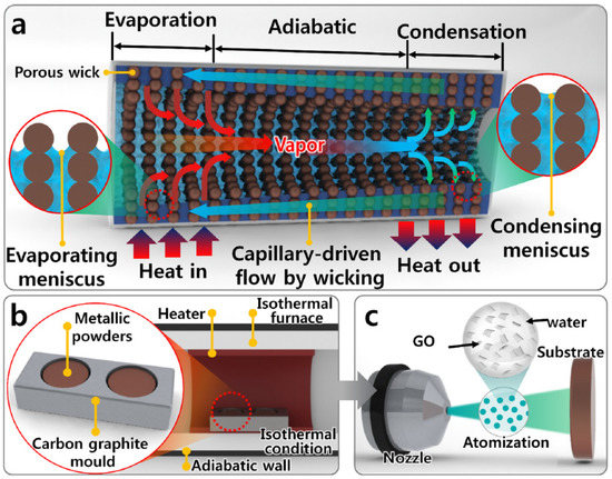 (a) Schematic of a heat pipe with a two-phase flow loop, (b) sinter of non-uniform copper particles at 600 °C using an isothermal furnace under a vacuum, and (c) suspension of graphene oxides in distilled water and the process of spraying this solution on copper wicks [94].