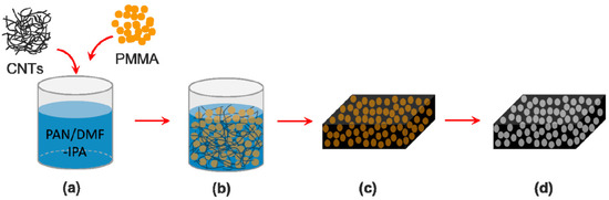 Schematic illustration of the fabrication process for preparing NC foam using the template method and PMMA microspheres. (a) The CNTs were dispersed in Polyacrylonitrile (PAN)/Dimethylformamide (DMF)- Isopropyl alcohol (IPA) solution and then Poly methyl methacrylate (PMMA) microspheres were added in. (b) The well-dispersed CNT and PMMA microspheres in PAN/DMF-IPA solution after sonication. (c) The mixture of CNTs/PAN/PMMA microspheres after filtration. (d) The NC foam after thermal treatments [95].