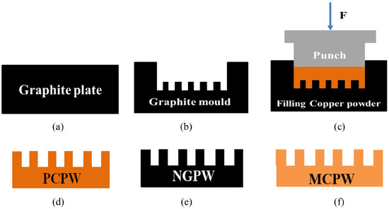 A schematic representation of the sample preparation processes form graphite plate to MCPW. (a,b) A micro grooved graphite mold is machined on a graphite plate by a computer numerical control machine. (c) Solid-phase sintering is carried out by filling the graphite mold with the copper powder. (d) PCPWs are finally separated from the graphite mold. (e) The cleaned samples which washed in acetone and ethanol solution are put into an oven and dried at 50 ◦C and finally, the etched sintered-powder wicks form a dense layer of oxide nanostructures (NGPWs). (f) Nano grass in the sintered powder wick is removed by a chemical cleaning process to leave porous structures covered by high density microcavities (MCPWs) [98].