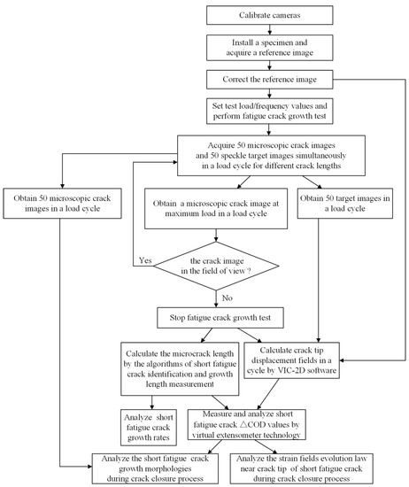 The flowchart of the overall method proposed in this paper is shown in Figure 1. Preparations before the FCG test included adjusting systems, calibrating cameras, and preparing CT specimens with microscopic speckles. The microscopic cameras were calibrated by using Zhang’s calibration method [29]. Two calibration boards with different specifications were made. Microscopic cameras collect images from 6 different orientations separately. Distortion coefficients of the cameras are calculated by using the spatial locations of these images. One side of the specimen is polished to a smooth surface with diffuse effect, and the other side is covered with microscopic speckles. The specimen is installed on the hydraulic servo fatigue tester, and a microscope speckle image of crack tip without load is acquired and corrected to be used as a reference image for DIC. The FCG test is performed after setting the load and frequency values. A total of 50 microscopic crack images and 50 speckle target images are acquired simultaneously in a load cycle at different crack lengths by dual microscopic cameras, and the acquired images are in the defined position in the computer. The microscopic crack image under the maximum load is observed; when the crack image is in the field of view, the experiment will continue. Conversely, the test is stopped when the crack length exceeds the field of view. The crack length is calculated and the SFC growth rate is analyzed by using SFC identification and length measurement algorithms to process the microscopic crack images at maximum force value. Speckle target images are corrected, and displacement fields of the SFC tip are calculated by using VIC-2D software. The crack-opening displacement (COD) is measured by using the virtual extensometer technique to determine the SFC crack-closure behavior and morphologies during the crack-closure process. The evolution law of strain fields near the crack tip region of SFC is obtained during the crack-closure process, according to the displacement fields of SFC and the evolution law of crack-closure effect.
