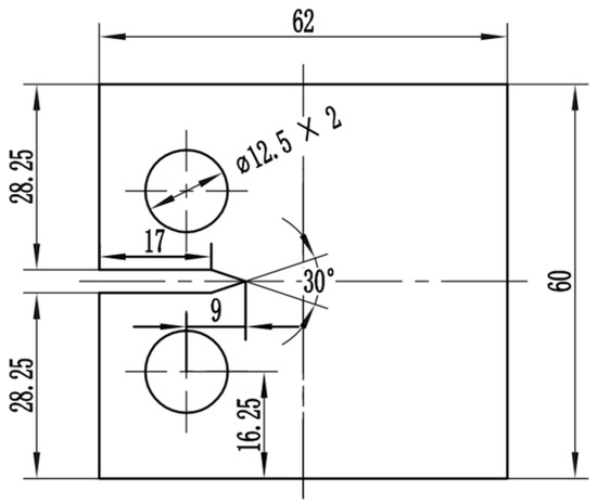 The material used in this investigation is Q&P980 high-strength steel. The mechanical properties under room temperature obtained from material tensile test are listed in Table 1. The chemical composition of base metal in wt.% includes Cr 15.6, Mo 0.63, O 0.55, Nd 0.25, Sn 0.11, C 0.11, and Fe is the balance. An average grain size of the material was measured to be approximately 4.5 µm. All the CT specimens were machined from the same steel plate. The geometric dimensions of CT specimens are 62 mm (length) × 60 mm (width) × 1.4 mm (thickness), as shown in Figure 2. The side of the specimen is polished to a smooth surface with a diffuse effect, making it convenient to observe and identify cracks. Microscopic speckles were prepared on the other side of the sample for microscopic DIC analysis.