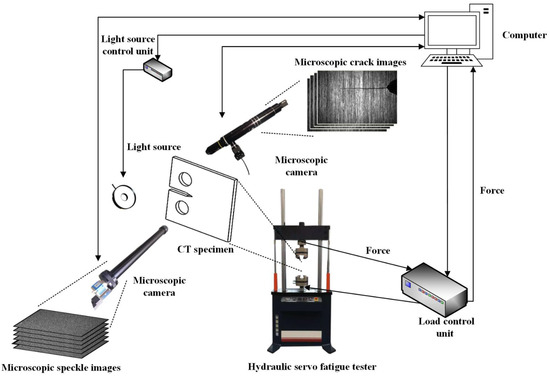 As shown in Figure 3, the system components are a hydraulic servo fatigue tester (PWS-50), CT specimen, load control unit, dual microscopic cameras, light source, light source control unit, and computer with fatigue test control software; microscopic-image-acquisition software; digital-image-processing software, including VIC-2D and DIP short-fatigue-crack identification and measurement software. During the FCG test, the load sensor transmits the force applied on the specimen to the load control unit, which converts the analog force signal into a digital signal and feeds it back to the computer to realize FCG, microscopic-image acquisition, and digital-image processing.