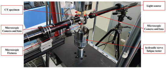A labeled photo of the experimental platform is shown in Figure 4. The CT specimen is installed on the hydraulic servo fatigue tester. Dual microscope cameras are installed on both sides of the specimen. The morphology and length of microscope cracks are acquired on one side of the specimen. The working distance between the lens and the specimen is 10 mm, and the field of view is . The transverse field of view is slightly larger than the length of the SFC. The spatial resolution of the corrected image is 0.338. The other side is used for microscope speckle images’ acquisition. Since the microscope speckle images need Micro-DIC analysis, the transverse field of view is larger than the length of SFC. The distance from the lens to the specimen is 110 mm, and the field of view is . The spatial resolution of the corrected image is 1.032 . A speckle image of the specimen is acquired and corrected as the reference image.