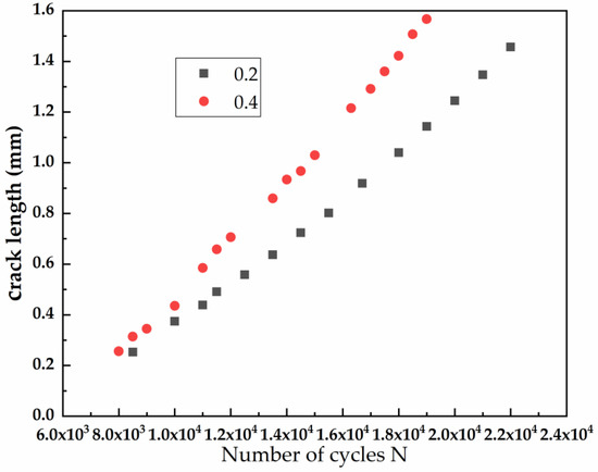 Figure 8 shows the FCG rates under two stress ratios. During short-crack growth stage, the FCG rates increase slightly with the increase of cycle number, and the larger the stress ratio, the faster the FCG rate. The difference of FCG rate between two stress ratios also increases gradually with the number of cycles.