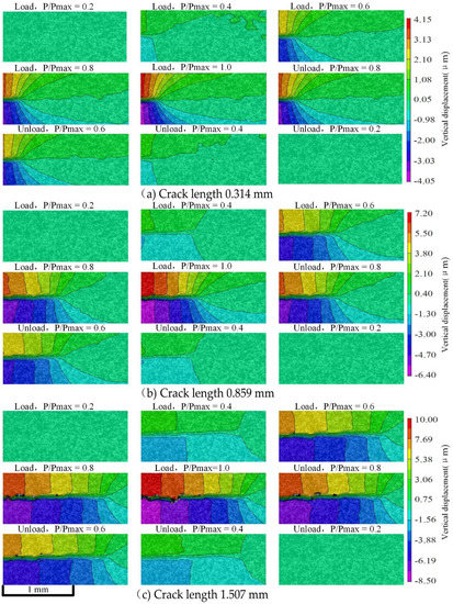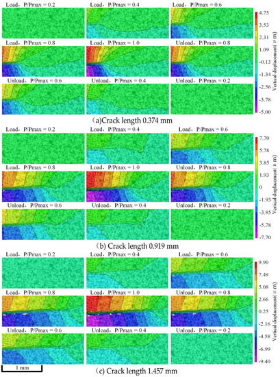 The vertical displacement field results at two different stress ratios are shown in Figure 9 and Figure 10, which include three sets of images at different crack lengths, respectively. Each set of images includes nine resulting images at a different P/Pmax (P is the current load, and Pmax is the maximum load) in one loading cycle. At the same stress ratio, vertical displacement increases with the growth of the crack length. Vertical displacement in a load cycle is basically symmetrical during loading and unloading. When the load is near , the vertical displacement changes greatly. When the two stress ratios are close, the increase of vertical displacement is highly correlated with the crack length and is less correlated with the stress ratio.