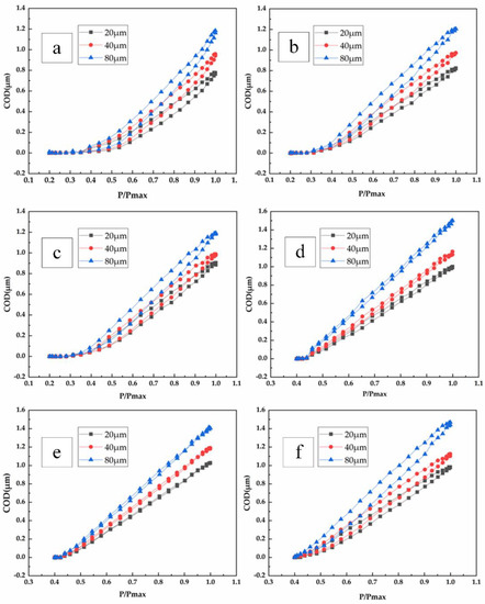 P/Pmax-ΔCOD curves of different lengths at stress ratio of 0.2: (a) crack length 0.374 mm, (b) crack length 0.919 mm, and (c) Crack length 1.457 mm. P/Pmax-ΔCOD curves of different lengths at stress ratio of 0.4: (d) crack length 0.314 mm, (e) crack length 0.859 mm, and (f) crack length 1.507 mm.