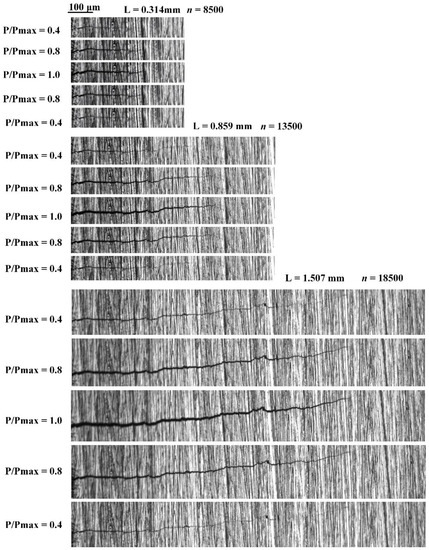 Figure 12 shows the evolution of the SFC morphology during crack closure with different lengths and a stress ratio of 0.4, where P/Pmax represents different load stages. According to the conclusion in Section 5.2, when the stress ratio is 0.4 and the SFC length is 0.859 mm, it will not open until P/Pmax = 0.43. Therefore, under the minimum cyclic load, the crack tip presents a closed state. When the load is from P/Pmax = 0.43 to 1, the crack tip is slightly opened to fully opened, and the closure behavior of short fatigue crack tip is weakened. On the contrary, when unloading, the crack tip exhibits a morphological evolution from fully open to close. The SFC morphologies at different lengths are consistent with the above conditions.