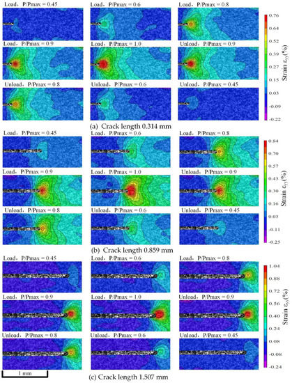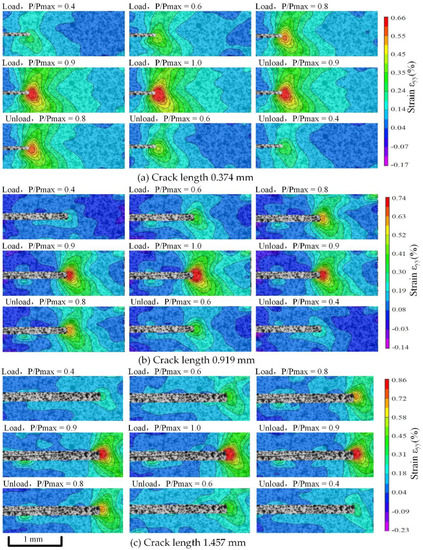 According to the algorithms in Section 4, the crack length was obtained. Micro-DIC analysis was performed again after deducting the crack area to obtain the real data of stress distribution after SFC growth. Figure 13 and Figure 14 show the evolution of vertical strain fields under each crack length, with stress ratios of 0.2 and 0.4, where P/Pmax represents different load stages. At the same stress ratio, the vertical strain increases with crack growth. In the same fatigue cycle, the vertical strains during loading and unloading are basically symmetrical. It is slightly larger when unloaded, which is related to the inability to fully closing the crack mentioned in Section 5.2.