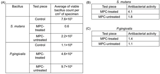 Five experiments were performed for evaluating the antibacterial effect of MPC-coating treatment, and the respective antibacterial values were calculated. The antibacterial product was determined to evaluate the antibacterial effectiveness. The optimal antibacterial activity using testing methods of these standards is 2.0. The antimicrobial activity of the MPC-coated group against S. mutans was 4.1, while that of the MPC-untreated group was 1.8.