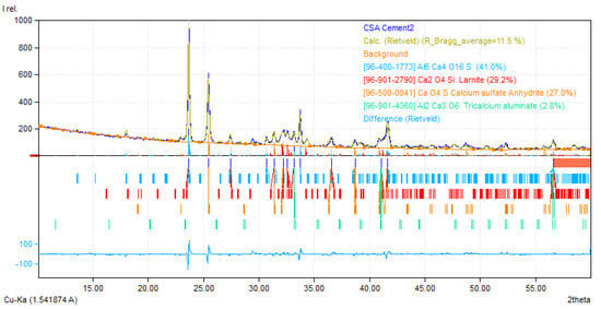 Rietveld refinement of the X-ray powder diffraction pattern of the CSA cement, showing percentages of the constituent minerals. The reference patterns for the identified phases, ye’elimite [], belite (larnite []), anhydrite [], and aluminate [], are from the Crystallography Open Database (COD).